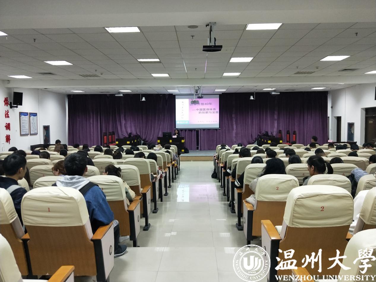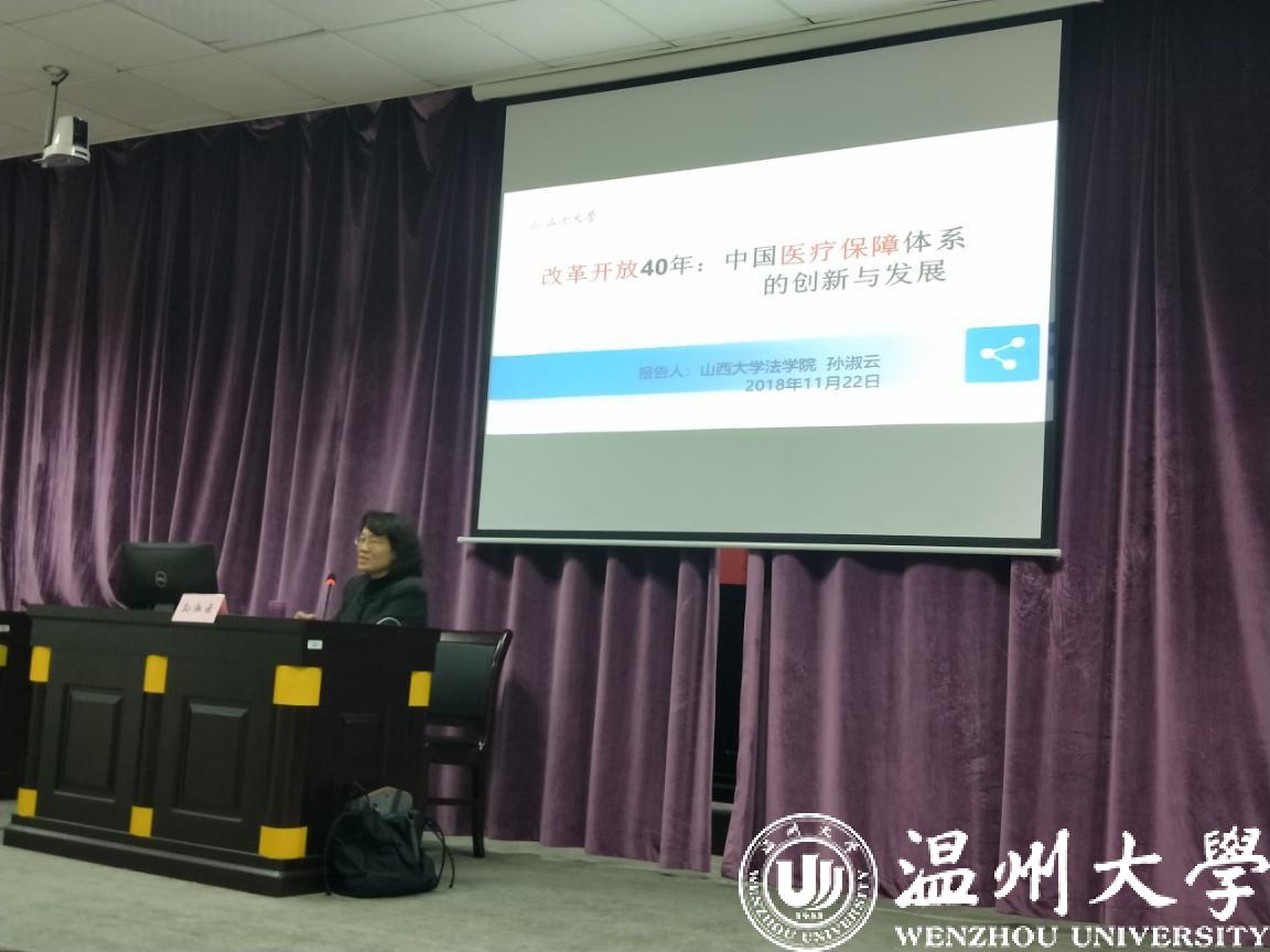2018年11月22日晚,山西大学教授、成人影院 博士生导师孙淑云教授在温州大学法政学院模拟法庭开展专题讲座,讲座由周湖勇老师主持,法政学院的研究生和本科生同学以及法学界共130多人参加了本次讲座。本次讲座的主题为“改革开放40周年以来成人影院 医保体系的创新与发展”。