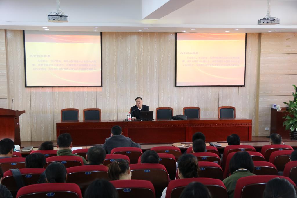 2017年11月22日下午,在人文学院报告厅举行了法政学院与体育学院全体教工和研究生学习会,邀请我校党委委员,宣传部部长潘玉驹作学习十九大报告精神的辅导讲座。