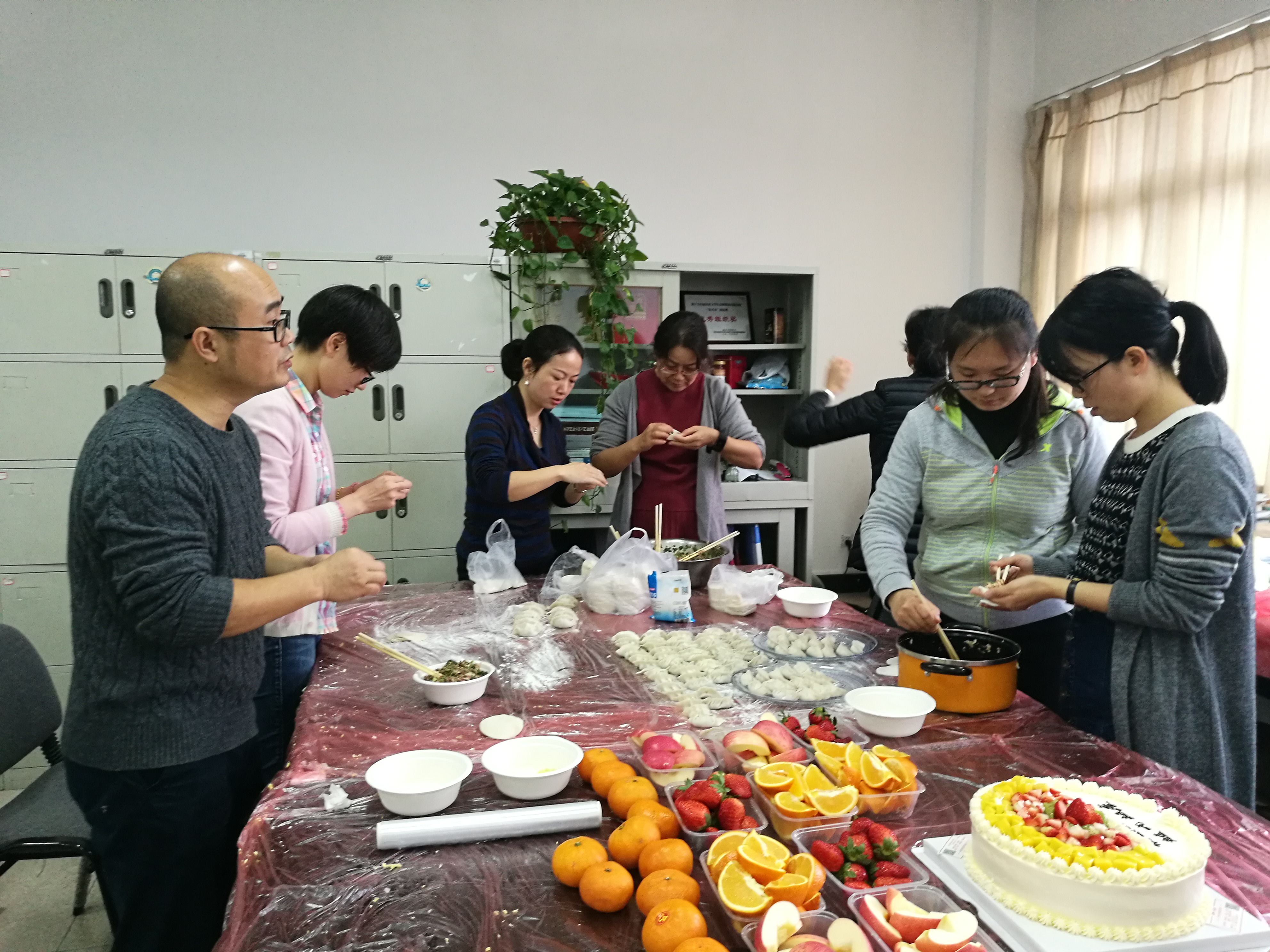 活动前,老师们各自准备了饺子皮、肉馅、蔬菜、水果等食材,还有老师专门预定了漂亮的蛋糕,活动一开始,大家便热情高涨,积极参与,合理分工,剁馅儿、切菜、拌馅、包饺子......整个过程既分工协作,又活泼有序,大家你一言我一语,现场洋溢着欢声笑语和浓浓的节日氛围。 随着一碗碗热腾腾的饺子端上来,浓浓的饺子香,使大家忘却了冬日的寒意。