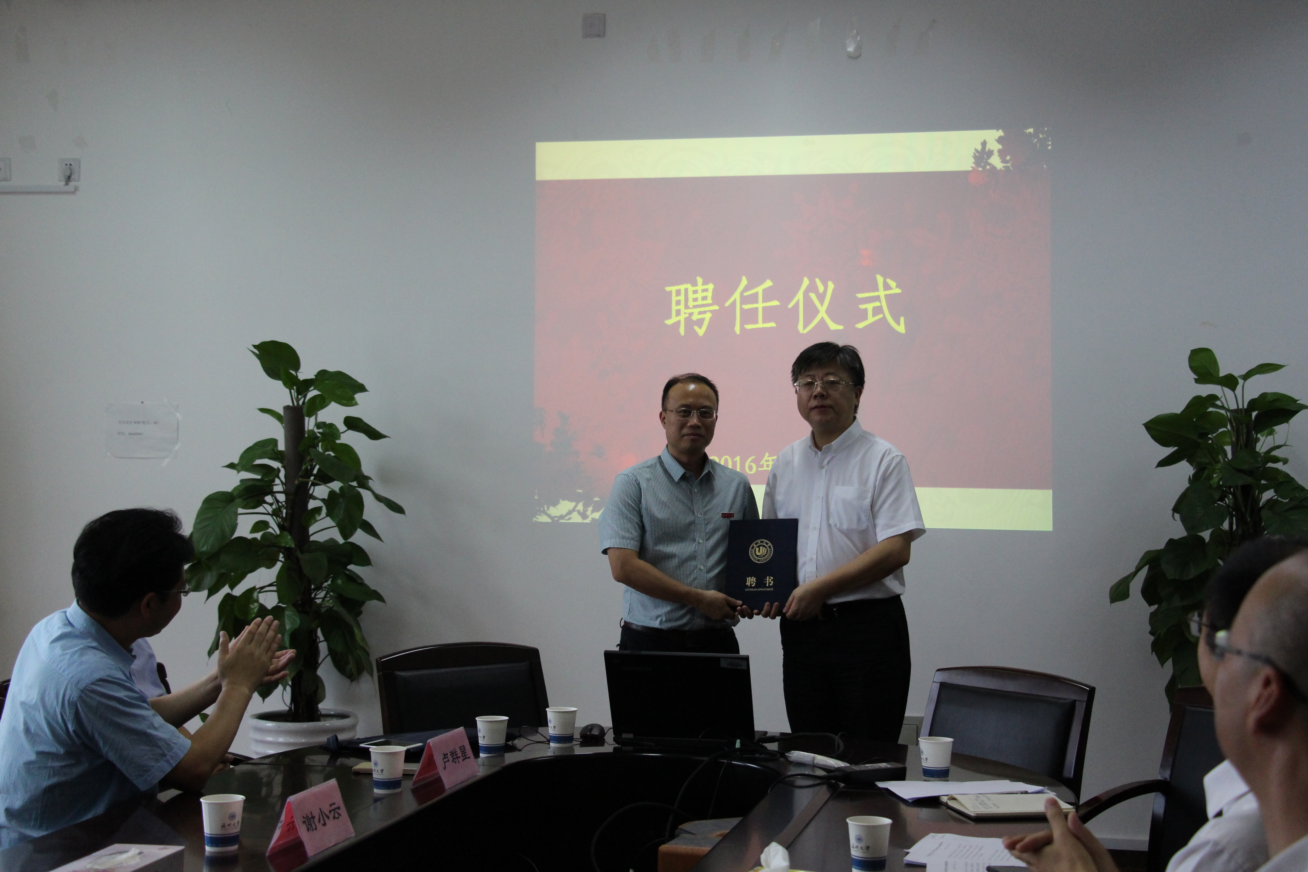 同时,谢小云被聘为我校兼职教授,李校堃校长为谢小云主任颁发聘书,并佩戴温州大学校徽。