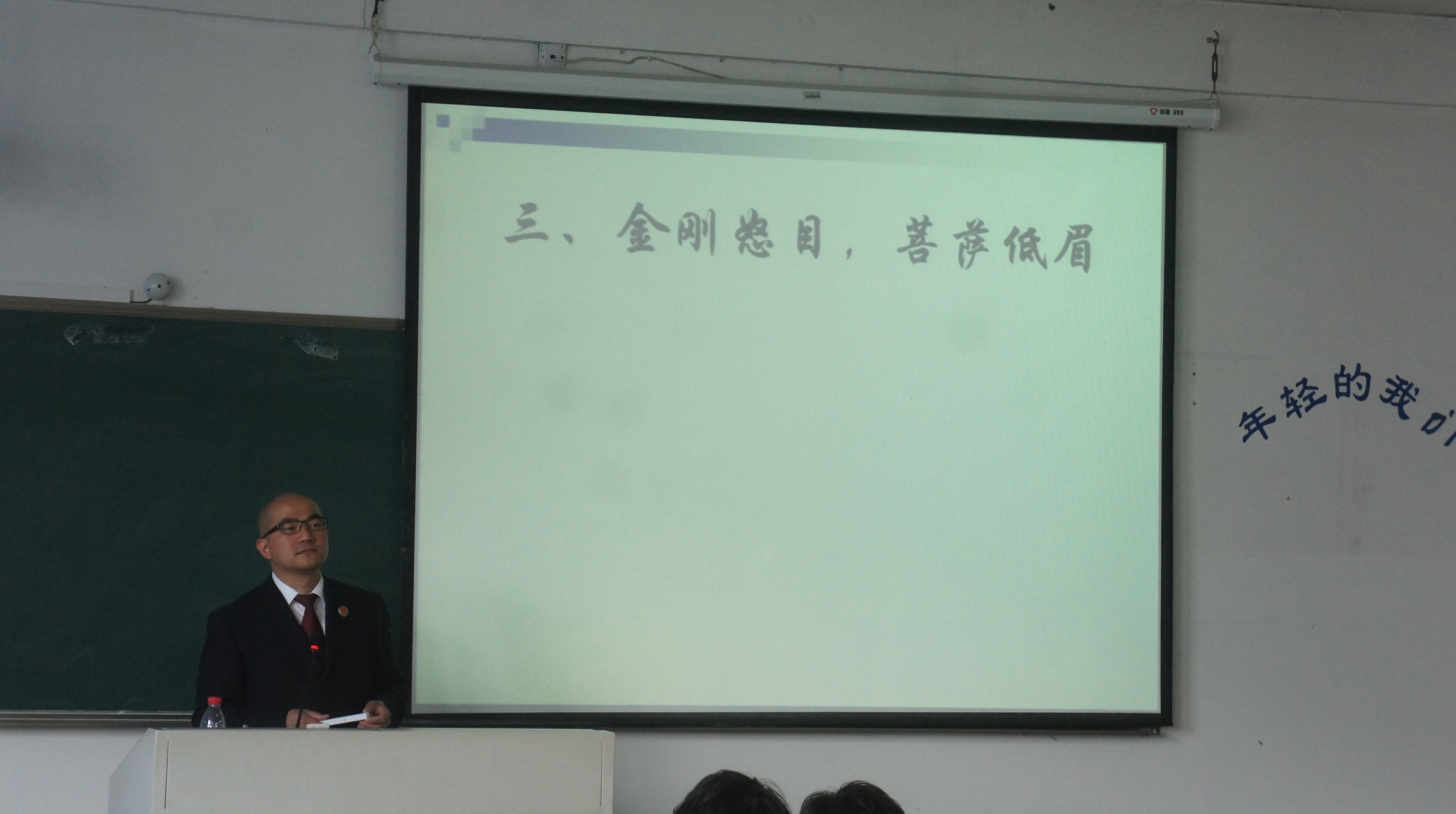 金检察官的讲座题目是《漫谈自侦案件的审讯技巧》,讲座伊始,他拿自己的光头开涮,一下子让讲座的气氛活跃起来,他说自己的初衷是想给尚未踏上社会、白纸一样的大学生们设定一条底线,为他们未来的职业生涯打一点底色:不管将来身处什么地方、干什么工作,都牢记法律是关于正义的实务,不忘"当为哑巴开口,为一切孤独伸冤"之初心;然后,金检察官旁征博引,从柏拉图到诸子百家,从四大名著到金庸武侠,从神话故事到身边经典案例,信手拈来,条分缕析,将自侦案件的审讯技巧娓娓道来,一改法律说教痕迹,将很专业的法律问题以幽默通俗的语言表达出来,形象地告诉大家,自侦案件的审讯工作就是一个与各大高手过招的工作,要阅历丰富,眼光独到还得关注细枝末节,方得从蛛丝马迹中查获案件证据。