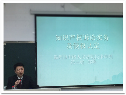 知识产权的保护在中国经济文化快速发展的大背景下越来越受到重视,知识产权诉讼大案屡屡发生。郑庭长深入浅出地通过几个案例来分析知识产权领域的现状,如著名的商标战争"唯冠与苹果IPAD商标之争"、PRETUL案、涉外的"卡斯特红酒案"、温州本土的"达芙妮案"。商标是知识产权界颇为重要的领域,也是知识产权诉讼的多发区域。当然,还有涉外贴牌加工的法律问题,"乔丹"案,"爱马仕"案等。郑庭长以其扎实的理论基础和丰富的办案经验阐释了知识产权的重要性。讲座期间,郑庭长与同学们的互动也非常和谐,他以其独特的魅力吸引着同学们的目光,整场讲座下来,听众席上掌声如雷。
