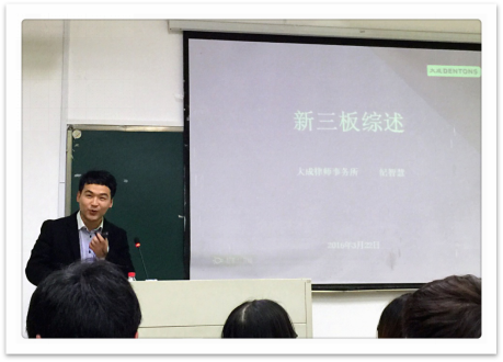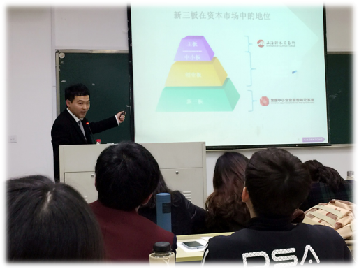 "新三板"对法学生来说无疑是一个陌生的词汇,为了同学们更好地理解,纪律师先用一个案例引入,得到了全场的关注。不同于耳熟能详的主板、中小板和创业板,"新三板"不仅新,也相对来说更难理解。纪律师深入浅出地告诉我们:"新三板"市场原指中关村科技园区非上市股份有限公司进入代办股份系统进行转让试点,因挂牌企业均为高科技企业而不同于原转让系统内的退市企业及原STAQ、NET系统挂牌公司,故形象地称为"新三板"。新三板的意义主要是针对公司的,会给该企业,公司带来很大的好处。资本主义的市场少不了律师的存在,一个公司从挂牌上市到破产清算都需要律师的参与,这也是非诉律师的职业前景之一。之后,纪律师又向我们简单介绍了挂牌条件规则和挂牌操作流程,一个半小时的讲座转瞬即逝,我们也学到了不少课堂之外的东西。