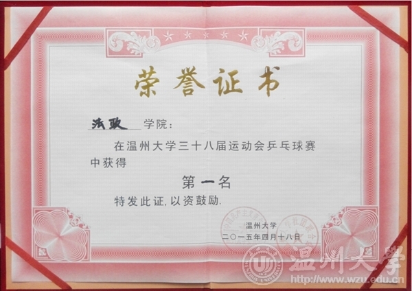 2015年4月18日,由温州大学体育运动委员会主办的第三十八届运动会乒乓球赛顺利开幕,我校各学院均派出代表队参赛。法政学院乒乓球队表现出众,获得第一名的好成绩。