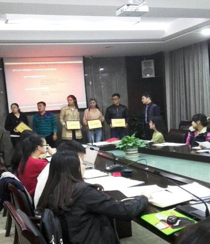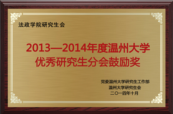 2014年11月27日感恩节之际,我院研究生会成员李根雪代表法政研会出席了校研究生会组织的温州大学第三届优秀研究生分会的颁奖典礼。我院研究生会荣获2013-2014年度"优秀分研会鼓励奖"光荣称号。