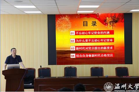 10月30日下午,温州大学副校长蔡曙光在北校区信息楼报告厅作题为《牢记初心使命、自觉锤炼党性修养》的专题党课,全院党员参加了学习。蔡校长从党性修养必须做到“五个过硬”、党性修养存在不足的具体表现和新时代党员干部如何锤炼党性修养三方面分享了自身的认识和体会。他指出,践行初心、履职尽责,党性修养是制胜的法宝。新时代的党员干部要在常学常新中培养党性修养,信念过硬是基石、政治过硬是根本、责任过硬是保证、能力过硬是关键、作风过硬是本质体现。最后,蔡曙光以“讲政治以养大气,多读书以养才气,淡名利以养朝气,敢负责以养浩气,不媚俗以养骨气”与在座党员共勉,号召大家做政治合格、信念坚定,严守规矩、纪律严明,道德高尚、品行端正,奉献担当、敢为善为的合格党员。