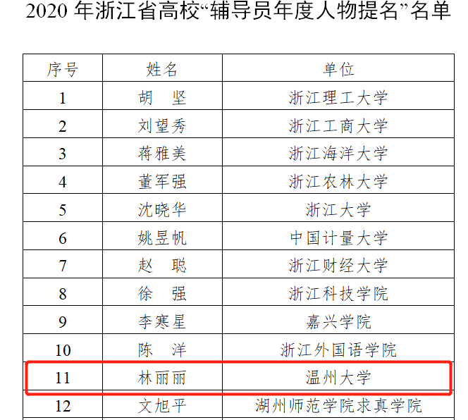 近日,浙江省高等教育学会思想政治教育研究分会公布了2020年浙江省“高校辅导员年度人物”选树活动评选结果,我院林丽丽老师喜获“2020年浙江省高校辅导员年度人物提名”奖。