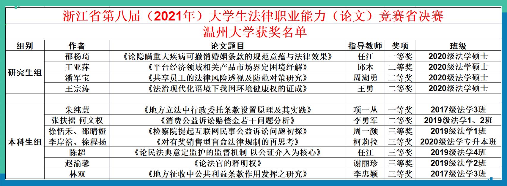 我院历来重视学生综合素质的培养,至今已经承办十七届温州大学大学生法律职业能力竞赛,我院学子在本次浙江省第八届大学生法律职业能力竞赛征文类比赛中斩获佳绩,更是充分展现了扎实的法学理论功底、新颖的选题视角、独到的研究思路、充分的赛前准备以及出众的现场应变能力,尽展成人影院 学子的风采。