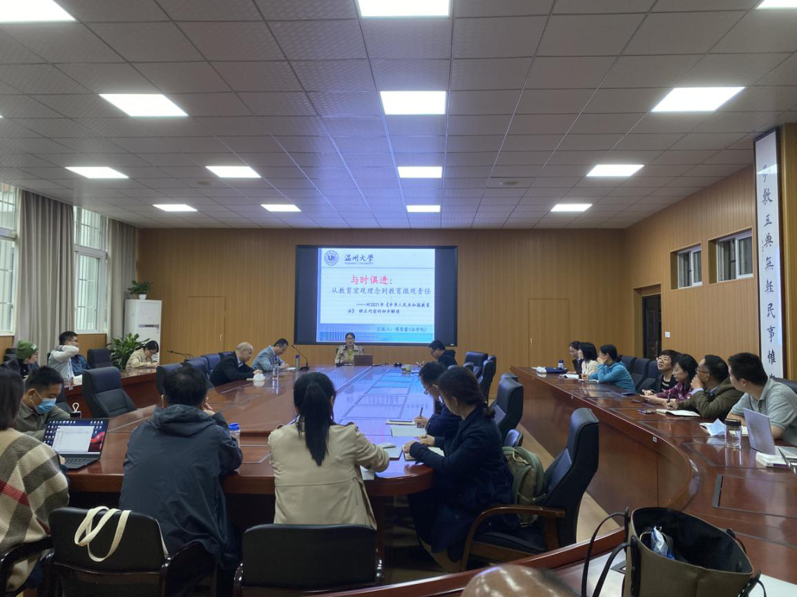 周慧蕾老师作《新教育法》专题解读。她从回顾《教育法》的地位与文本框架、追溯《教育法》的制定与修订历、探析2021年《教育法》修改的背景与目的、聚焦2021年《教育法》修改的主要内容、追问教育工作者如何学好、用好教育法五个方面对对2021年《中华人民共和国教育法》修正内容作了初步解读。针对教育工作者如何学好、用好教育法这一问题,她指出要用法理性思维学法用法、用体系性思维学法用法、用实践性思维学法用法,法律的生命在于实践,特别要注重对学生德的教育。