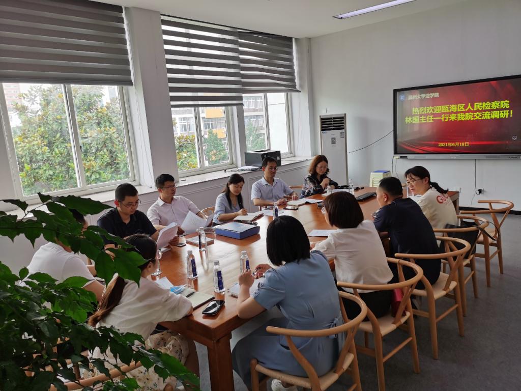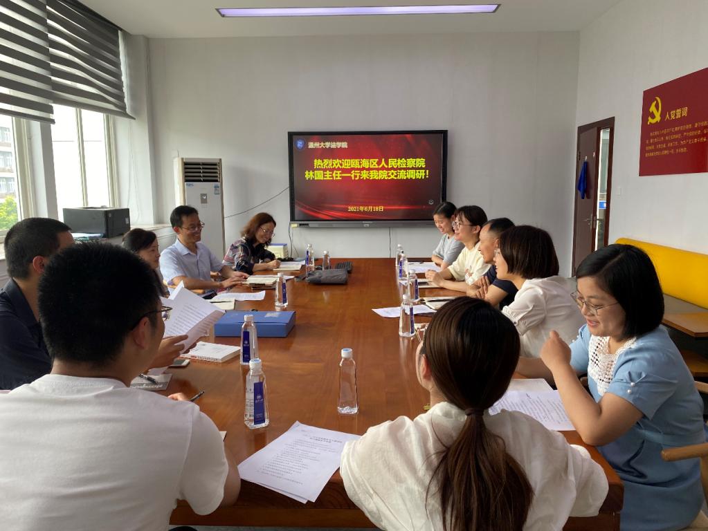 6月18日上午,瓯海区人民检察院第七检察部林国主任一行七人到我院进行考察交流,成人影院 法律系何平副教授、谢丽珍副教授、李勇军副教授、胡剑波副教授和柯宇航博士等参加座谈。