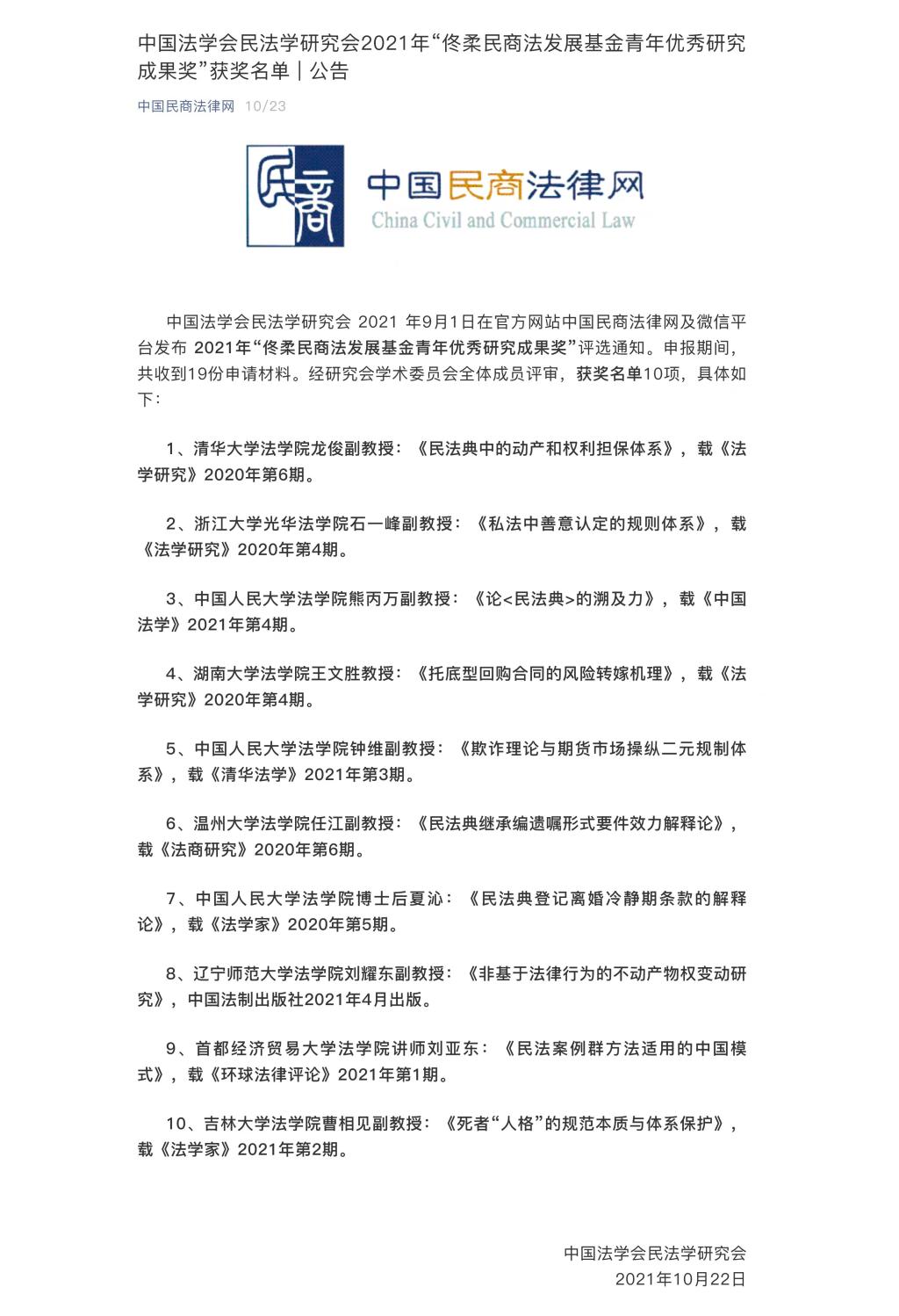2021年10月22日,中国法学会民法学研究会公布了2021年“佟柔民商法发展基金青年优秀研究成果奖”获奖名单,十项青年专家学者的成果入选。其中,我院任江副教授凭借论文《民法典继承编遗嘱形式要件效力解释论》获此殊荣。