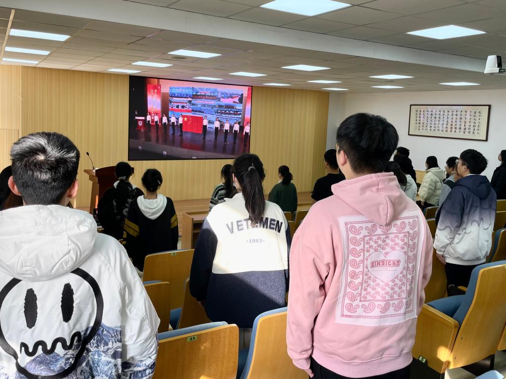 “我宣誓,忠于中华人民共和国宪法,维护宪法权威,履行法定职责,忠于祖国、忠于人民,恪尽职守、廉洁奉公,接受人民监督,为建设富强民主文明和谐美丽的社会主义现代化强国努力奋斗!”……铮铮誓言,掷地有声,同学们全神贯注,高举右拳,作出庄严宣誓,五星红旗扬起,自豪之情融于朗朗誓词中。随后,同学们合唱宪法主题歌曲《宪法伴我们成长》,从歌声中体会宪法温度、感受宪法力量。