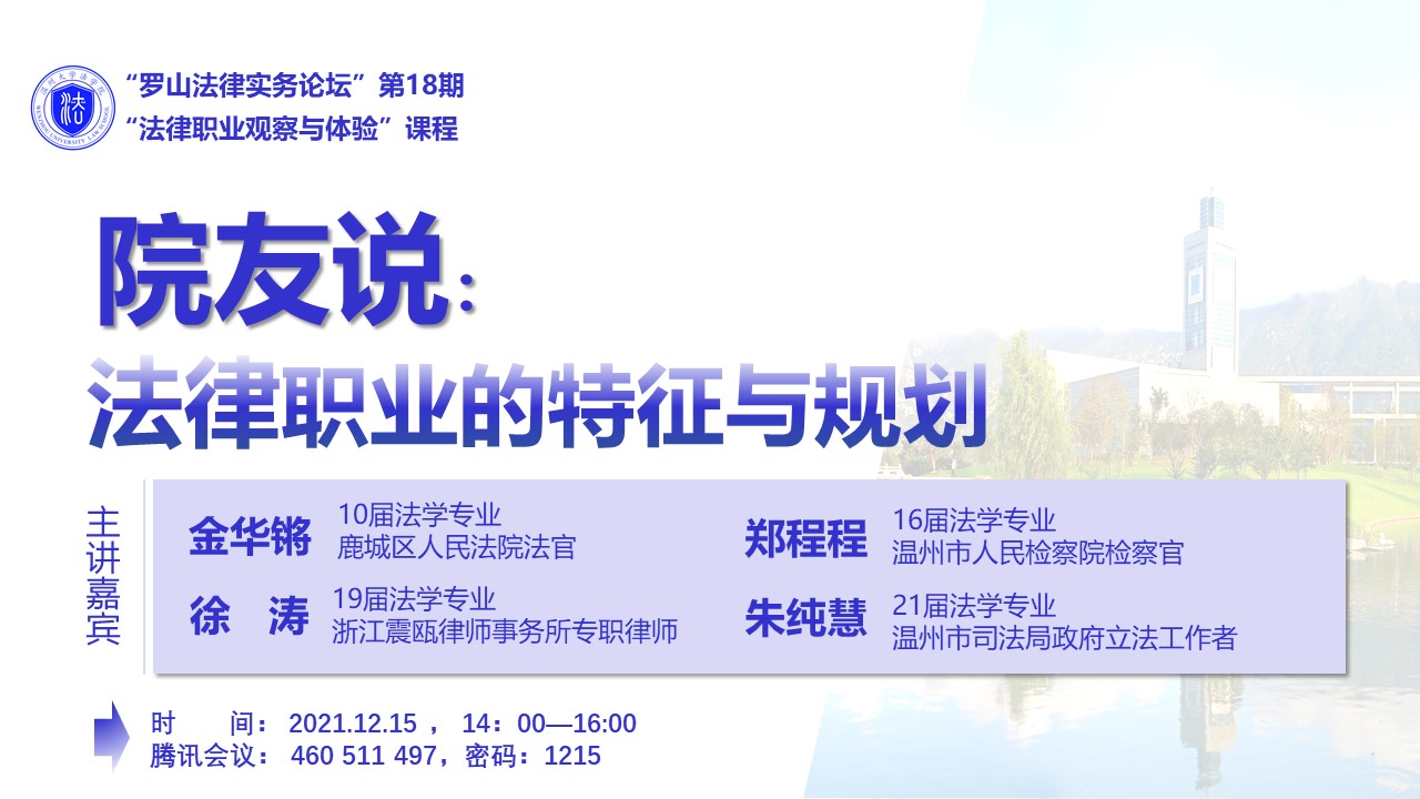 021年12月15日下午2点,成人影院-海外成人影视 优秀院友金华锵(10届法学专业,鹿城区人民法院法官)、郑程程(16届法学专业,温州市人民检察院检察官)、徐涛(19届法学专业,浙江震瓯律师事务所专职律师)、朱纯慧(21届法学专业,温州市司法局政府立法工作者)作客第18期罗山法律实务论坛,为我院大三学子开展题为《院友说:法律职业的特征与规划》的法律职业观察与体验课程。根据疫情防控的要求,本次讲座采取线上形式进行。讲座由成人影院-海外成人影视 项一丛老师主持,八名学生代表与谈,吸引了不少非选课的同学参加,共近200人参加了本次课程讲座。