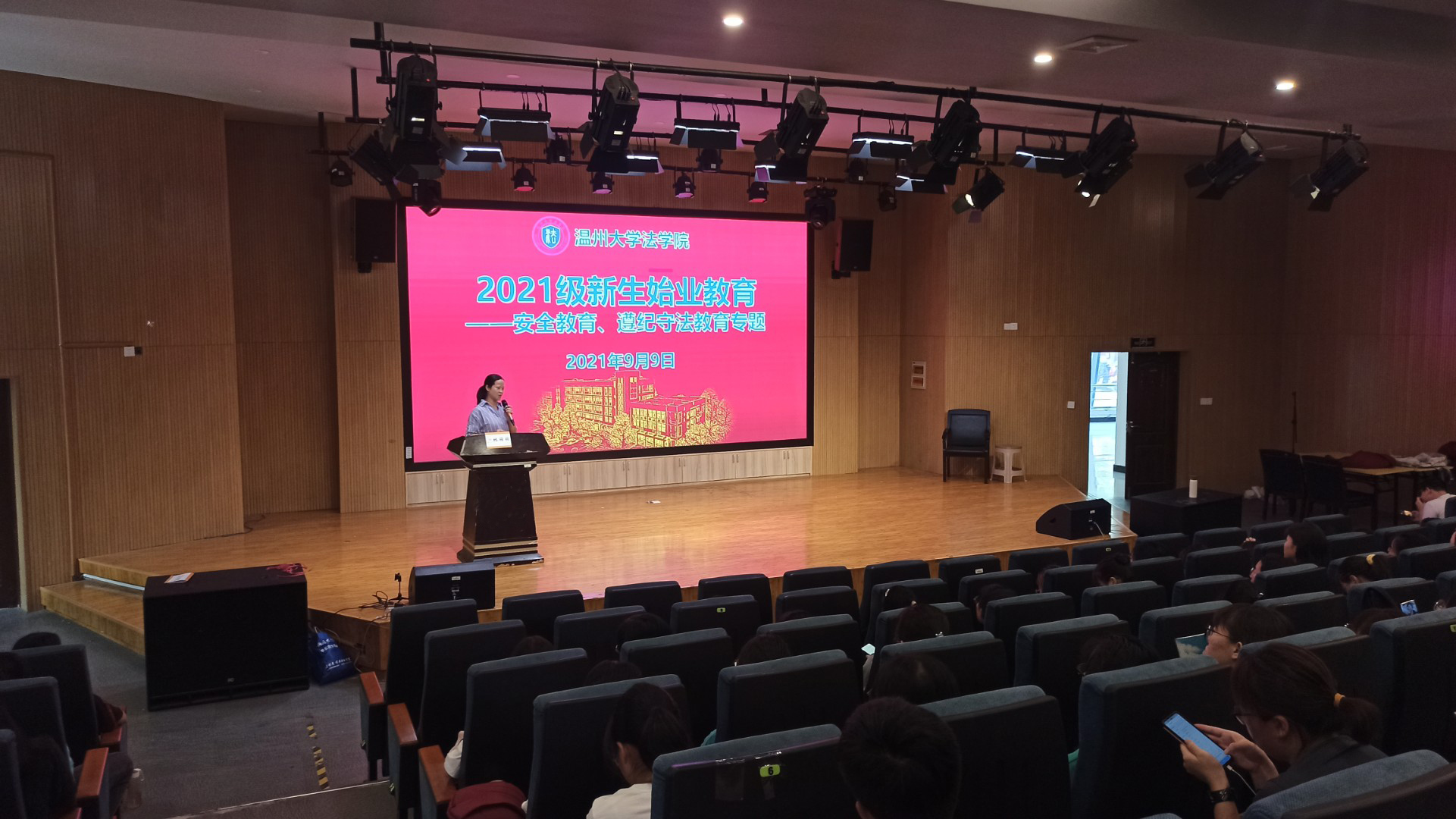 为了提高学生的遵纪守法意识、安全防范意识,学院开展安全教育活动。邀请温州大学保卫处高顺德老师给2021进行“以人为本,安全第一”专题讲座,由学院学工办主任林丽丽老师讲解《温州大学学生手册》中有关学生的管理规定。