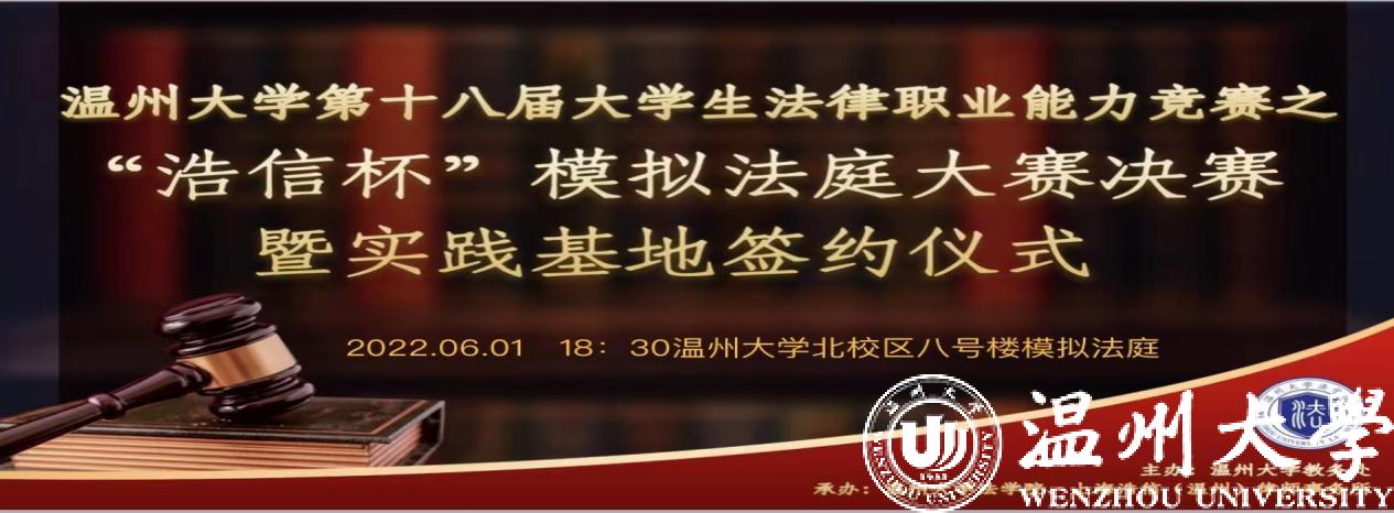 2022年6月1日晚,温州大学第十八届大学生法律职业能力竞赛之“浩信杯”模拟法庭大赛决赛暨实践基地签约仪式在成人影院 模拟法庭举行,温州市中级人民法院刑庭庭长杨国智法官、温州市人民检察院第一检察部王小琴检察官、上海浩信(温州)律师事务所主任章超凡律师、黄爱光律师、潘晓燕律师、郑冠律师、成人影院 副院长周湖勇老师、成人影院 谢丽珍老师、柯宇航老师出席,成人影院 200多名本科生、研究生参加。