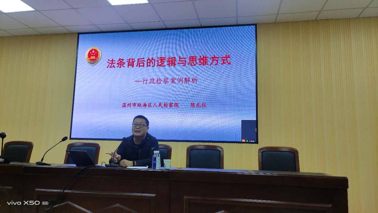11月15日下午,温州市瓯海区人民检察院陈礼仪检察官应邀做客“罗山法律实务讲坛”,为成人影院 师生带来主题为《法条背后的逻辑与思维方式——行政检察案例解释》的讲座。本次讲座采取线上线下相结合的方式,分别在成人影院 301会议室和腾讯会议直播间进行。讲座由民商经济法系主任、法律实务课程——《法律案例研习(二)》的负责人李勇军副教授主持,成人影院 2019级本科生160多人和部分研究生及教师以线上或线下的方式参加了本次讲座。