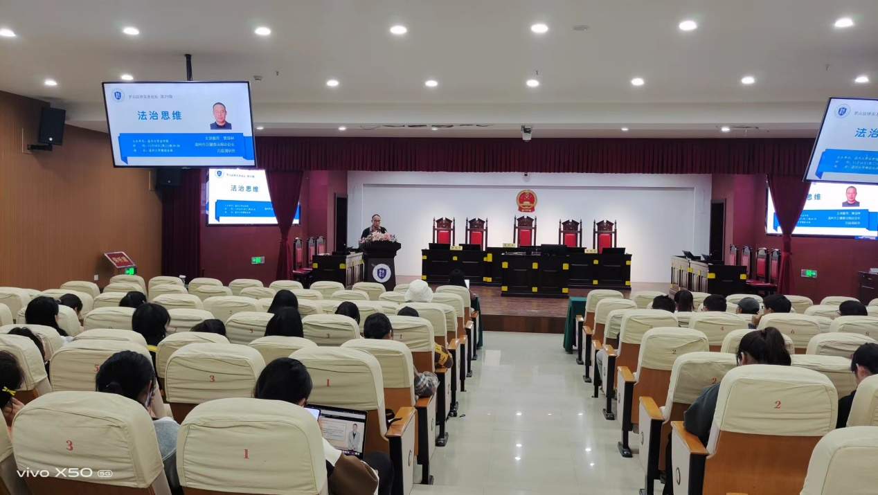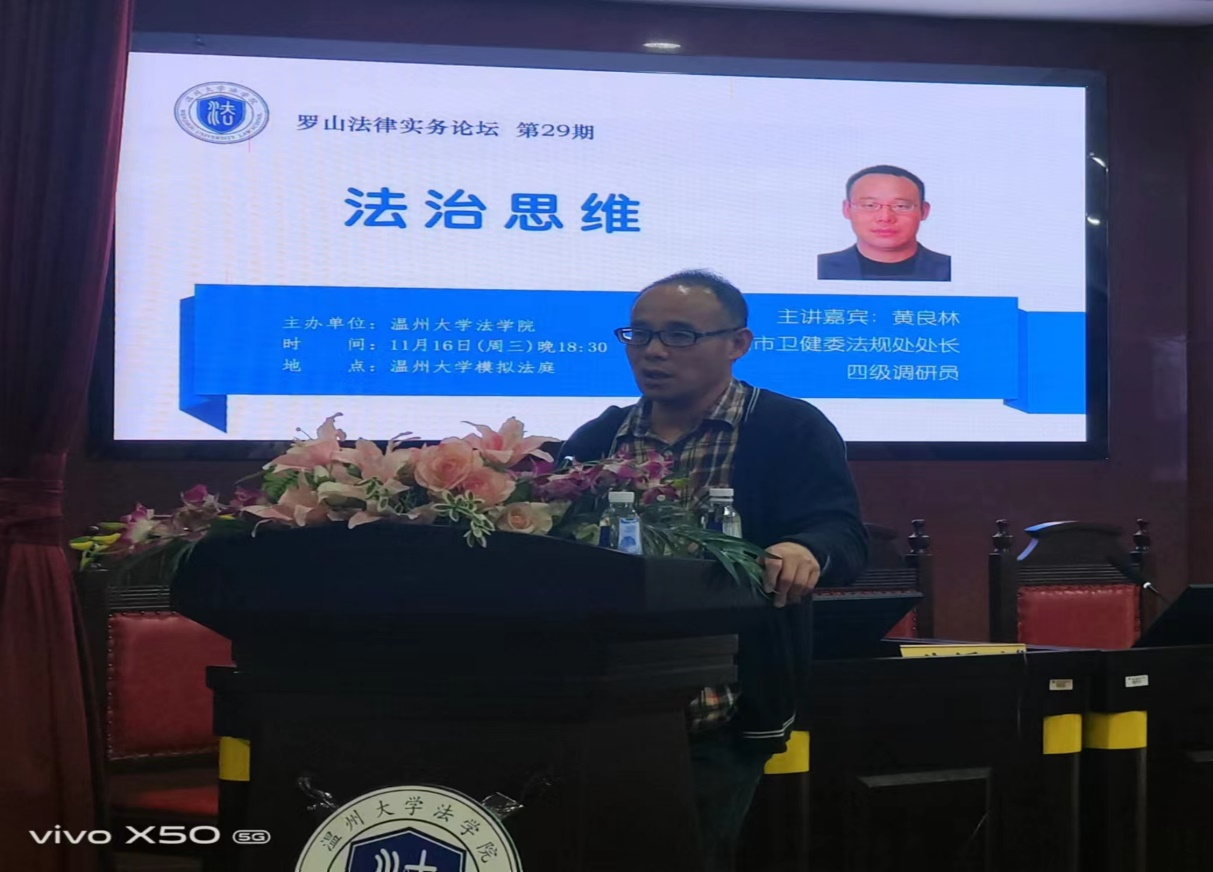 11月16日晚,温州市卫健委法规处处长黄良林应邀作客“罗山法律实务论坛”,为成人影院 师生带来题为《法治思维》的讲座。讲座由成人影院-海外成人影视 法学专业业负责人、民商经济法系主任李勇军副教授主持,在成人影院-海外成人影视 模拟法庭举行。