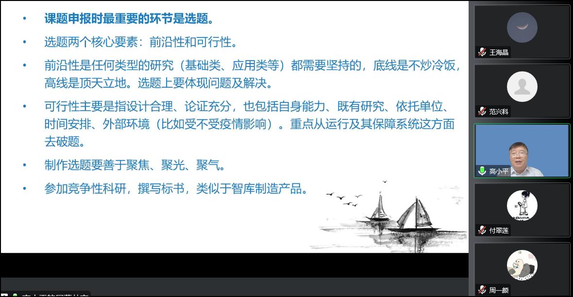 随后高小平老师对各位老师的申报书和选题进行了针对性指导,逐份提出修改完善意见,从选题、论证、框架等方面给出了具体修改建议,老师们纷纷表示此次线上辅导交流干货满满、收获颇丰。通过此次国家社会科学基金项目申报辅导交流会,与会教师进一步优化了项目申请书和选题方向,增强了项目申报的信心与动力。