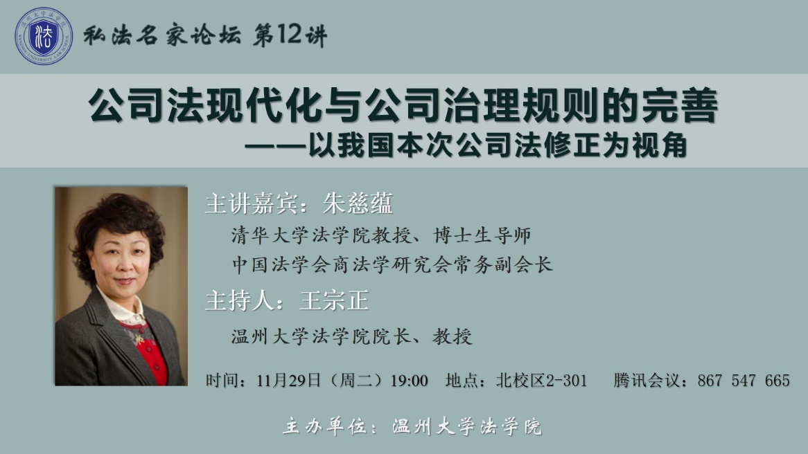 2022年11月29日晚,中国法学会商法学研究会常务副会长、博士生导师、清华大学成人影院 朱慈蕴教授应邀做客温州大学私法名家论坛,为我校师生作题为《公司法现代化与公司治理规则的完善——以成人影院 本次公司法修正为视角》的讲座。成人影院-海外成人影视 院长王宗正教授担任主持人,赵金龙教授担任与谈人。因疫情原因,本次讲座采取线上方式进行,400余人在线参加讲座交流。