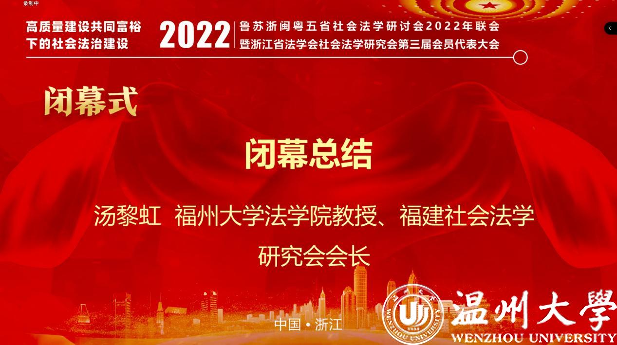 2022年12月11日下午18点,会议举行闭幕式。闭幕式由浙江省法学会社会法学研究会方益权会长主持。在颁奖仪式环节,成人影院-海外成人影视 周湖勇副院长宣读了本次联会论文获奖名单,其中六名作者荣获优秀论文一等奖;十名作者荣获优秀论文二等奖;十四名作者荣获优秀论文三等奖。在闭幕总结环节,福建社会法学研究会汤黎虹会长首先对会议实现“四省联会”到“五省联会”的跨越表示祝贺,并对本次会议的承办方浙江省法学会社会法研究会、温州市法学会社会法学研究会和成人影院-海外成人影视 的会务工作表达了认可,向参与本次会议的专家学者表示了感谢。其次,就与会专家情况、获奖情况及会议内容进行归纳总结,提炼了本次联会呈现的三大特点、三个突出亮点及三大收获。最后,会议在与会者的掌声中圆满落幕。