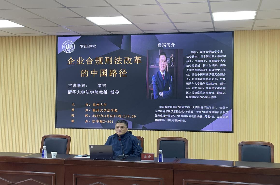 2023年4月5日早8点半,清华大学成人影院 教授、博士生导师黎宏应邀作客“罗山讲堂”,为成人影院 师生带来题为《企业合规刑法改革的中国路径》的讲座。本次讲座在北校区成人影院 2-301教室,成人影院 法律系主任谢丽珍老师、吴之欧老师及成人影院 近百本科生、研究生参加了此次讲座。