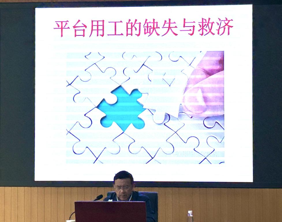 首先,黎建飞教授以“平台用工的缺失与救济”为主题展开论述。关于平台关系难以纳入劳动法的问题,黎教授认为从传统劳动法理论、劳动法基本制度等角度去论证平台用工是否符合劳动关系,以及将平台用工关系界定为类劳动关系、新型劳动关系等并不能完美解决当前问题。紧接着,黎教授推荐师生们阅读《江小涓谈学习中央经济工作会议精神体会之二:关于平台经济、民营企业和稳定预期》这篇文章,联系文章作者身份,其兼具学术背景、从政经历并长期涉略经济领域,有利于我们从法学视角之外研究劳动法,具有很强的启发性。黎教授认为,法律是对过去经验的总结,平台作为一个新事物,用既有的法律对新事物进行规范,这是很困难的;同时,法治的特征之一在于稳定性,稳定和创新是具有内在矛盾的,所以较为稳妥的做法应是先静观平台经济的发展,再慎重思考立法问题。此外,黎教授还特别教导现场的研究生同学,在研究生阶段应当把握时间,找到值得研究的主题,踏实研究,以期有所收获。