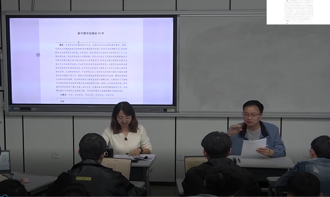 找出论文中存在的问题后,两位老师并没有直接给出解决方案,而是鼓励同学们思考和讨论“看完病”后如何为这篇文章“开药方”。同学们发挥集体智慧,纷纷指出:论文的标题应修改为“新中国成立70年守法理论的发展脉络梳理”、摘要需要删除重复表述进行提炼浓缩、关键词应该加上“守法观”、文献综述部分需要概括前人观点加强作者评述、论文还需要重点突出过去的理论研究对当前及今后开展相关研究的启示、论文结构框架需要重新进行搭建、论文格式需要按照《法学引注手册》进行校对完善,等等。