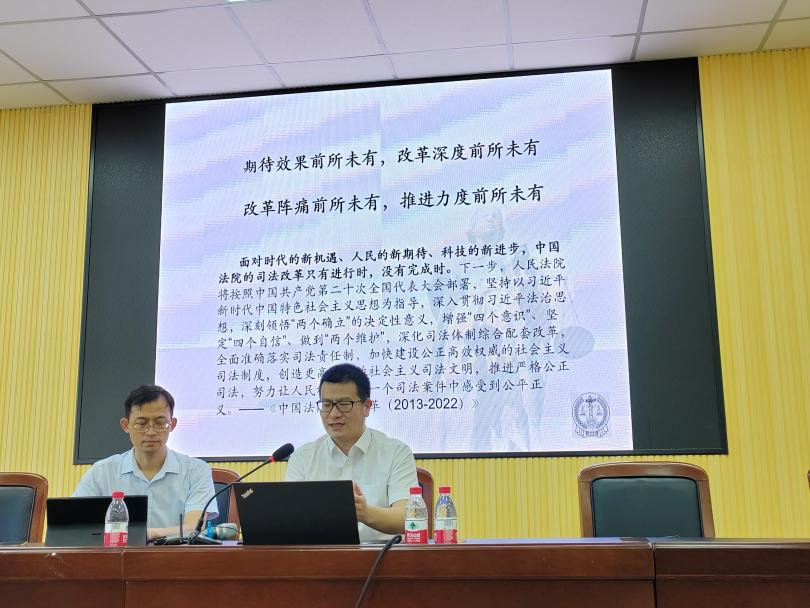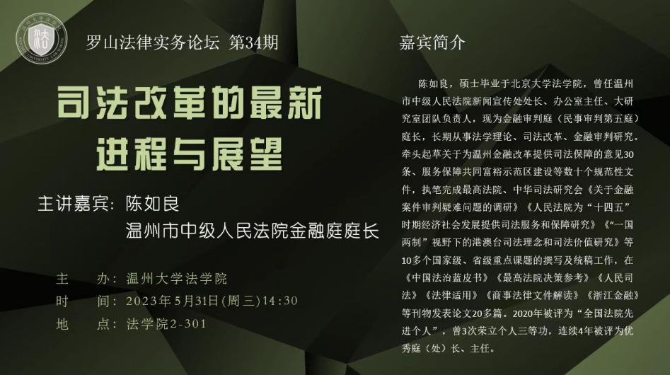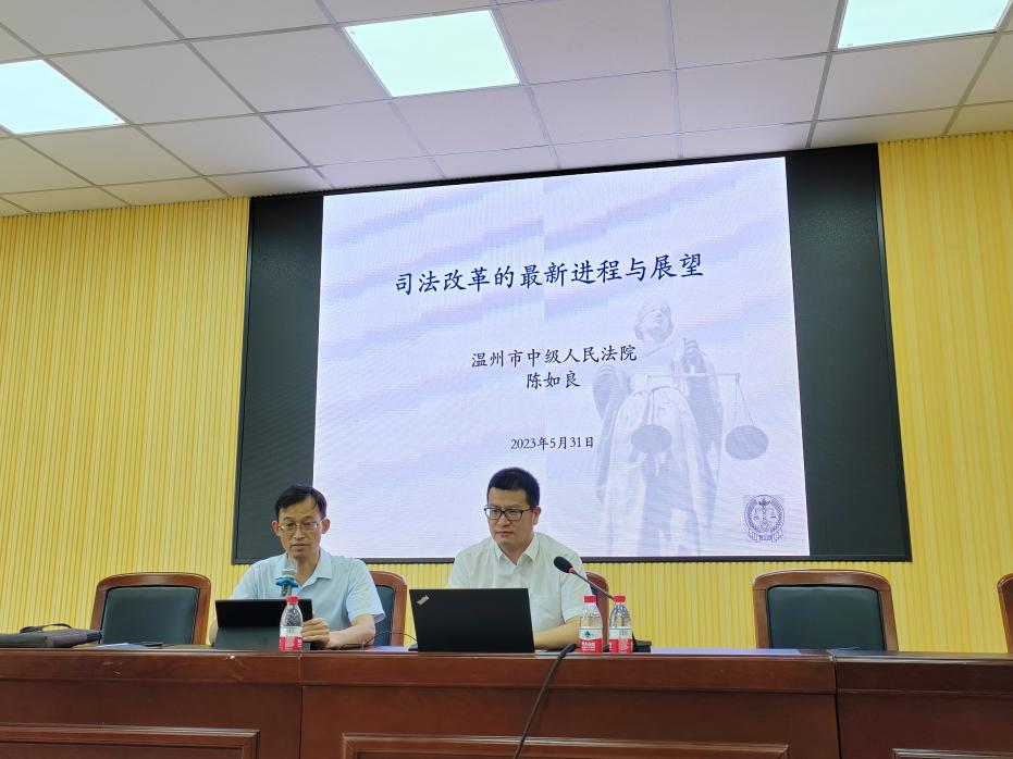 2023年5月31日下午,温州市中级人民法院金融审判庭(民事审判第五庭)庭长陈如良应邀作客罗山法律实务论坛,为成人影院 师生作专题讲座。本次讲座主题为“司法改革的最新进程与展望”,讲座由成人影院 法学专业负责人、民商经济法系主任李勇军老师主持。