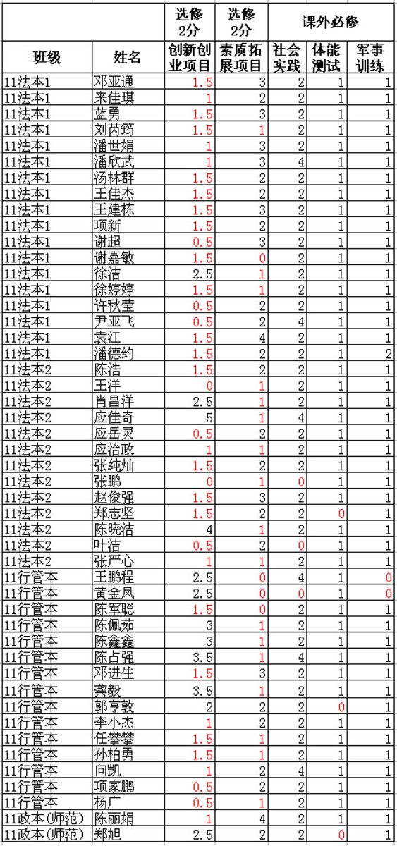 一、以下名单中标为红色的,表示课外学分还不够。