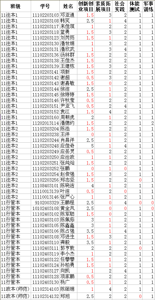 截止2015年1月9日,学校各部门已将本学期申报、补报的所有项目录入课外学分系统。我院11级毕业班还有50个同学的课外学分未修满,具体名单如下表。