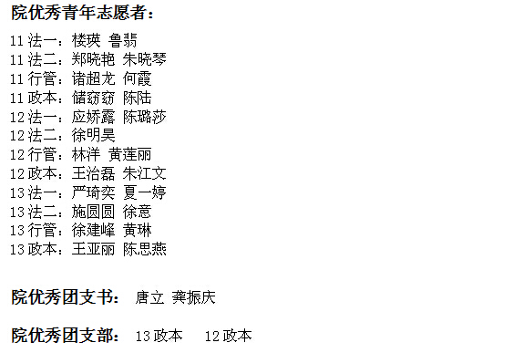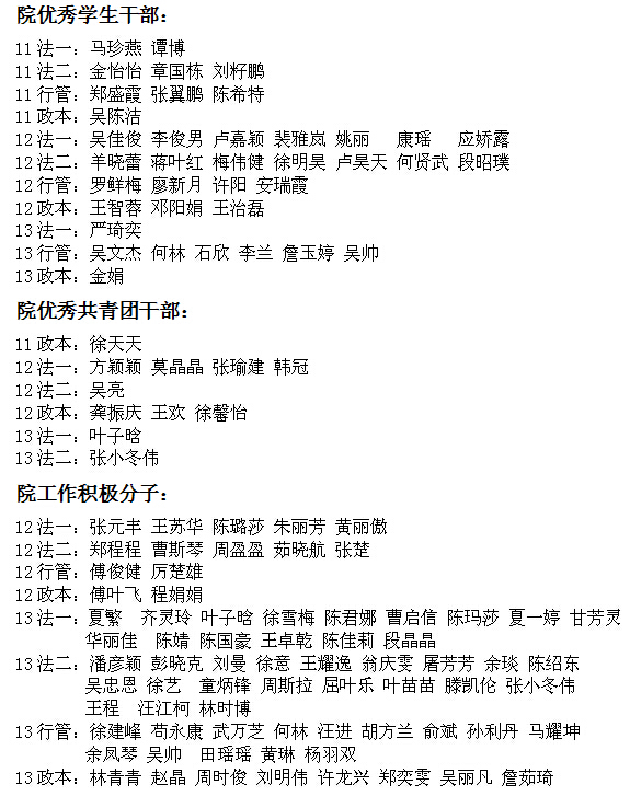 经各团支部、学生会、各社团组织推选,院团委组织联评后,现将法政学院2013-2014学年第二学期学生评优名单进行公示。公示期自2014年10月11日至2014年10月14日(共4天)。欢迎广大师生监督,如对公示内容有疑问,请联系法政学院团委组织部(手机15258095633,短号625633)或直接到学院学生科向老师说明。名单如下: