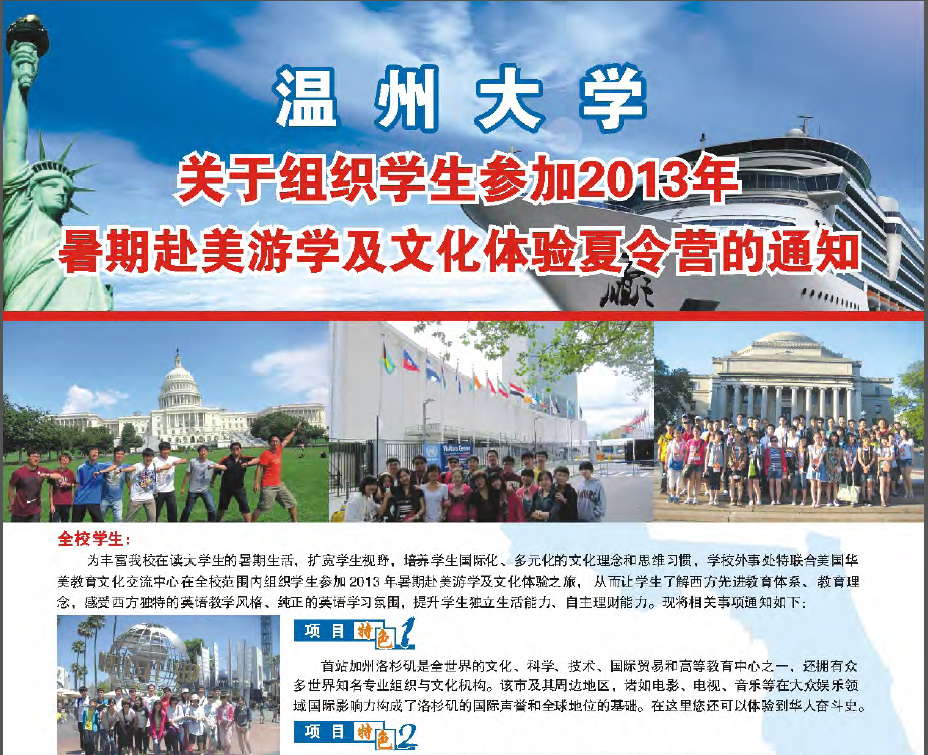 现有我校外事处和美国华美文化交流中心合办的"2013年温州大学学生暑期赴美游学及文化体验夏令营"项目,鼓励同学们踊跃参加此项交流活动。