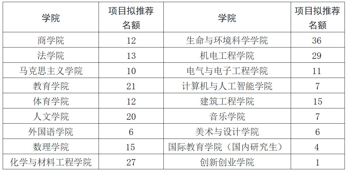 (一)各学院可推荐硕士研究生创新基金项目数不超过在校研究生人数6%。各学院可推荐参评名额(已核减未按期结题课题数)具体分配如下:
