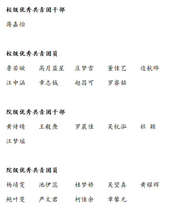 根据《团发〔2023〕7号:关于评选2022年度校“优秀共青团干部”、“优秀共青团员”的通知》,经学生本人申请、班级推荐、学院团委审核,通过民主投票选举产生,拟推选以下同学参评2022年度“校级优秀共青团干部”、“校级优秀共青团员”及“院级优秀共青团干部”、“院级优秀共青团员”,现将名单予以公示。