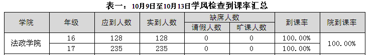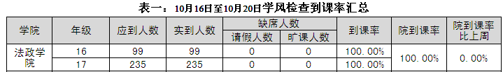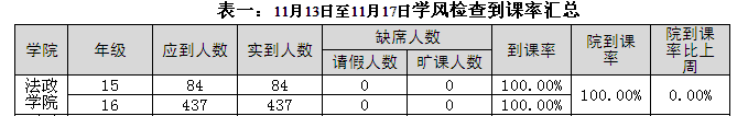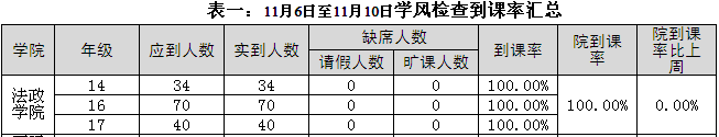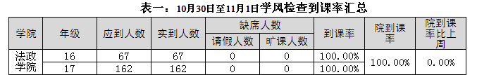 2017年11月6日至2017年11月10日,学生处组织人员对校本部110个班级的学生上课情况进行抽查。从抽查情况来看,学生上课秩序良好,上课教师普遍提前到达教室。法政学院具体情况反映如下: