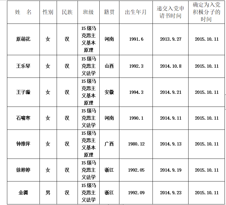 经中共温州大学法政学院研究生党支部培养考察,认为以下同志(具体名单附后)已基本具备中共预备党员条件,拟于近期发展,现予以公示。